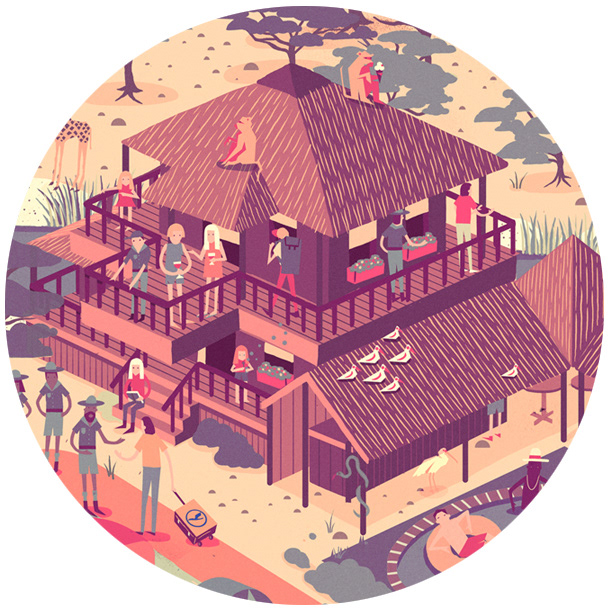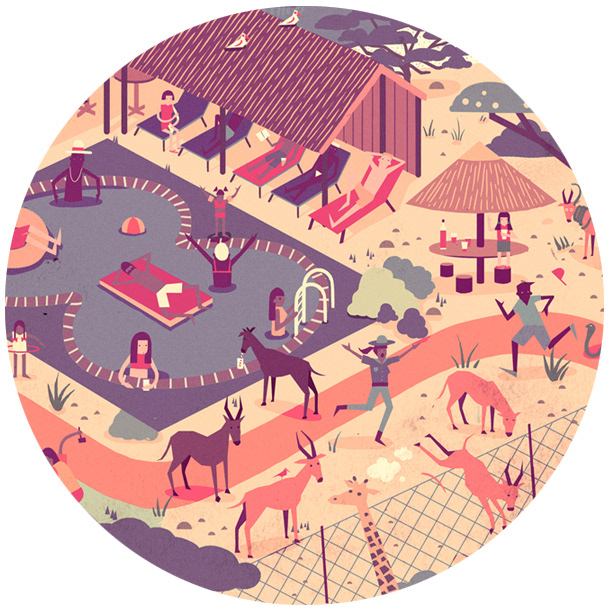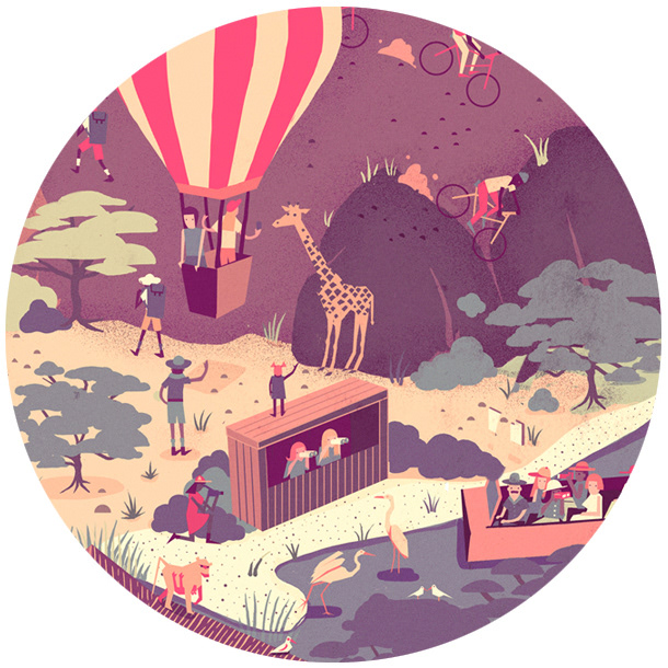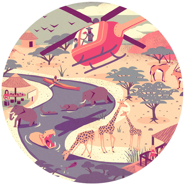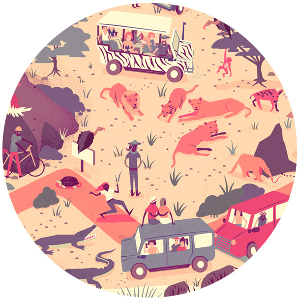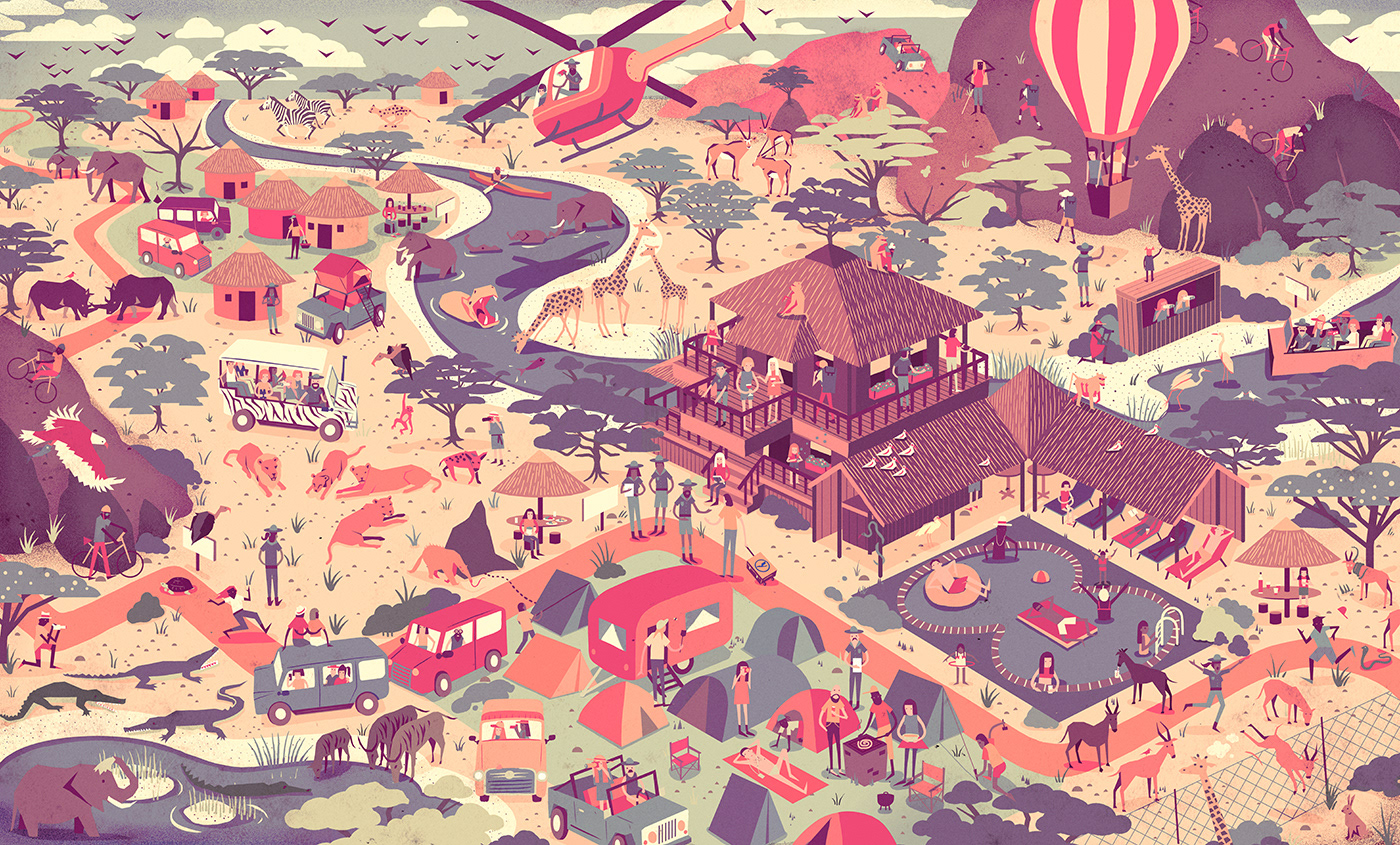 We worked with Plan Net in Germany to create a wimmelbilder illustration as part of a global promotion for Lufthansa. It appeared on a microsite where the visitor was challenged to explore and discover details within the illustration. Several artists took part in the campaign and we were designated a South African safari scene, with an aim to portray several interesting & entertaining situations taking place in the teeming crowd.