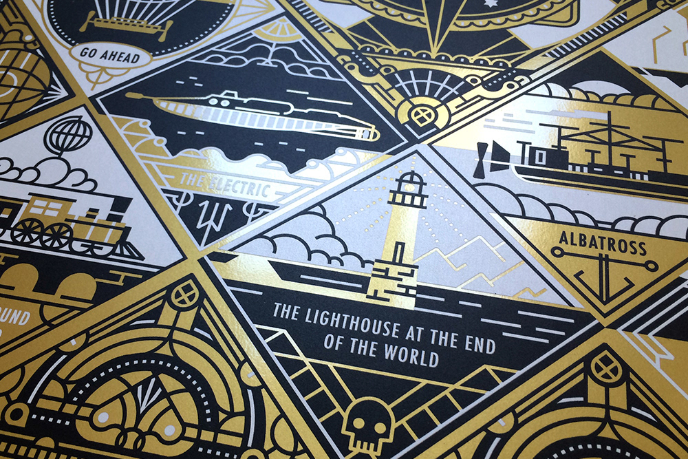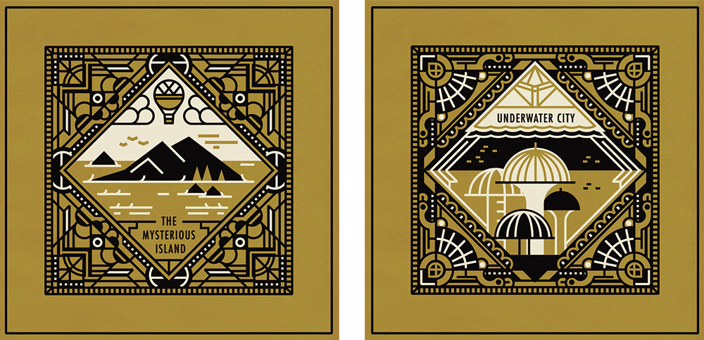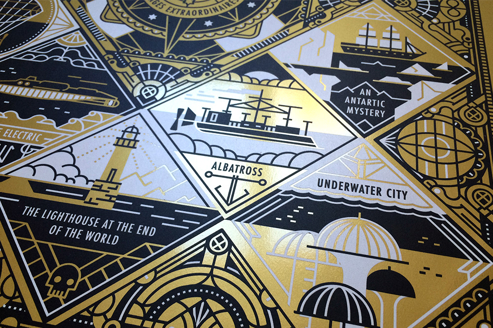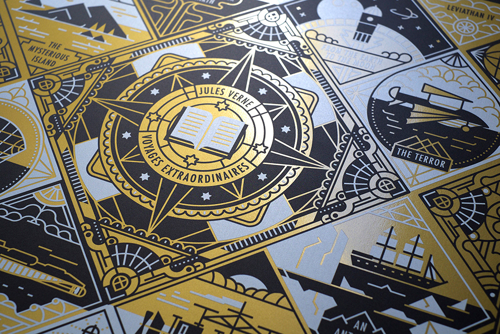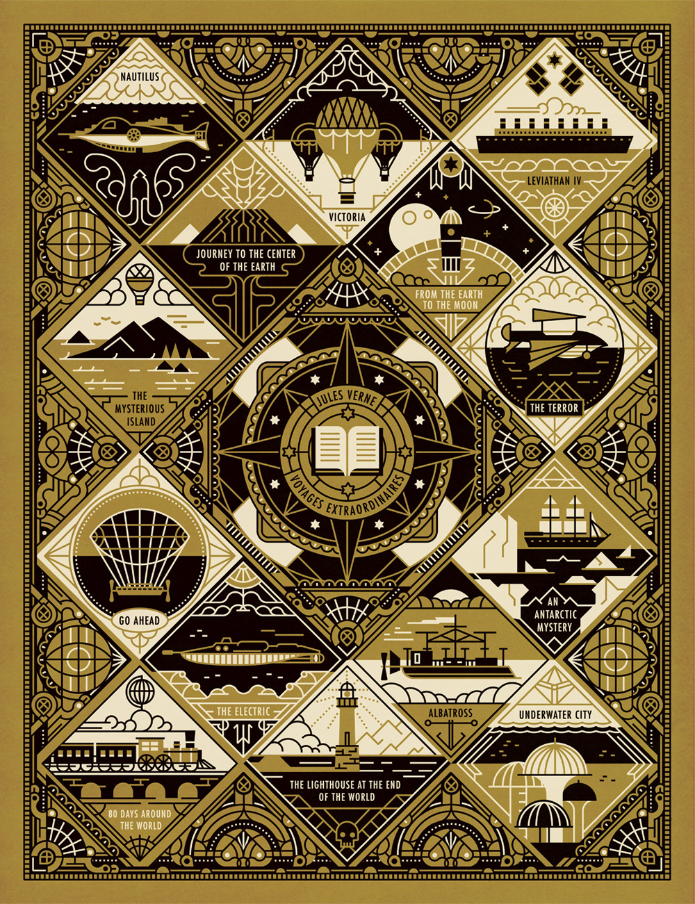 French novelist Jules Verne is renown for his science fiction literature. His Voyages Extraordinaires are a compilation of tales set in an array of exotic locations, with many fantastical machines and inventions. We illustrated this poster as a tribute to the author and these fascinating adventures. 2015 World Illustration Awards winner - Self-Initiated Professional