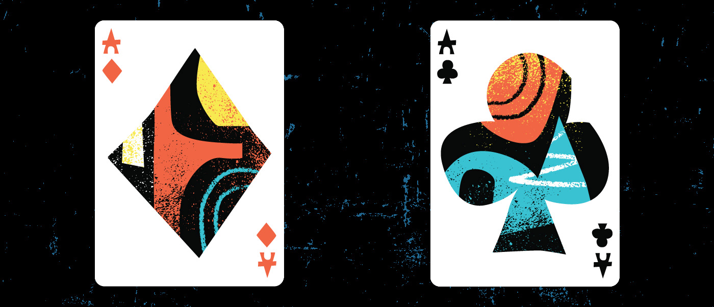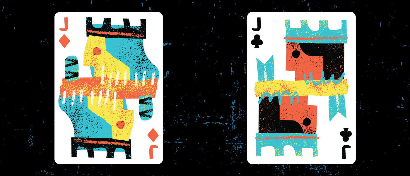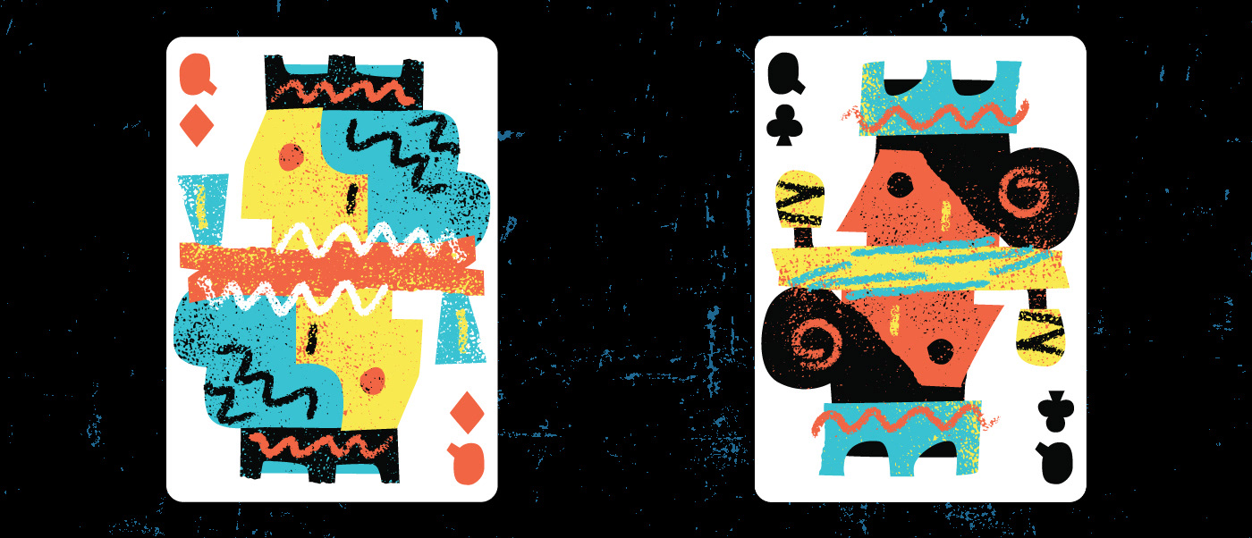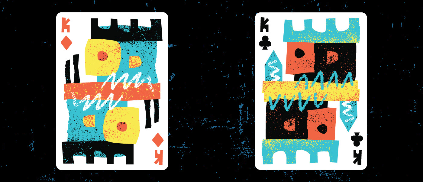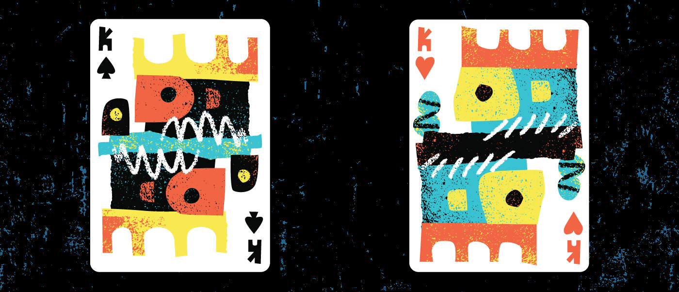 Our second custom playing card deck commissioned by Art of Play in San Diego. The abstract illustrated approach with bold, graphic shapes, punchy colors and grungy textures earned this deck the title "Off the Wall".