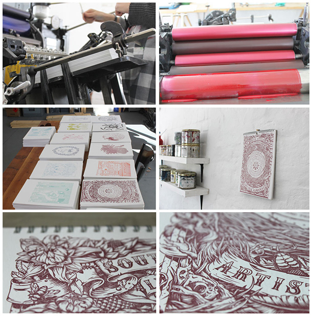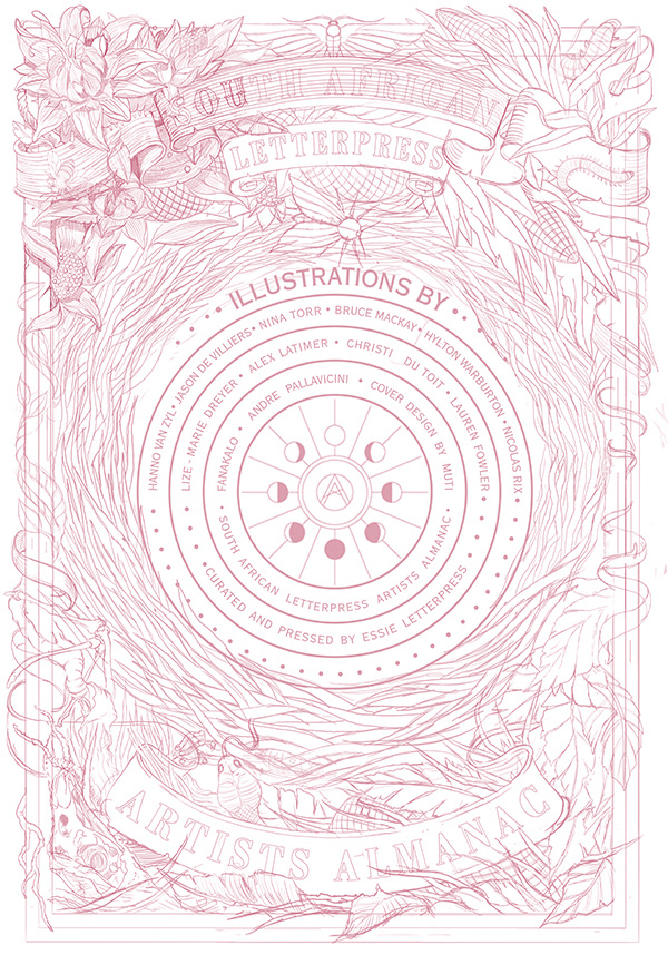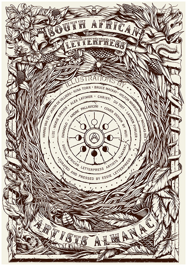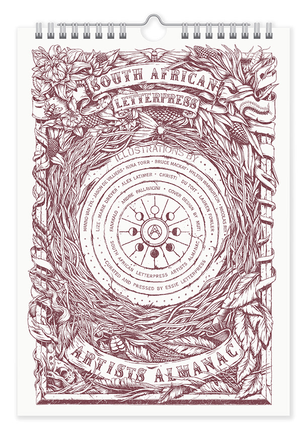 Essie Letterpress invited us to illustrate the cover for their 2014 calendar. The Artist's Almanac featured a different artwork for each month by several well known South African creatives. The final product was printed with a Heidelberg Platen press on Natural Evolution paper.