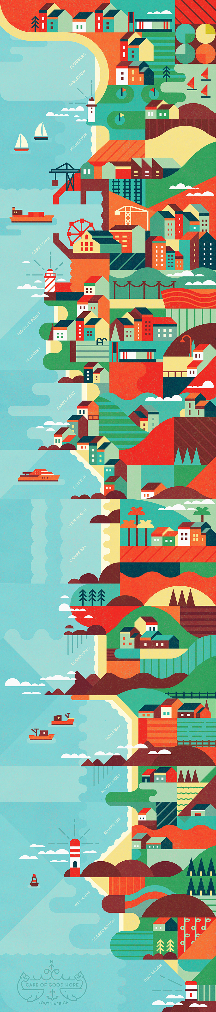 We had some fun creating this graphic interpretation of the Atlantic coast of South Africa. It shows the prominent spots along the western side of the Cape of Good Hope.