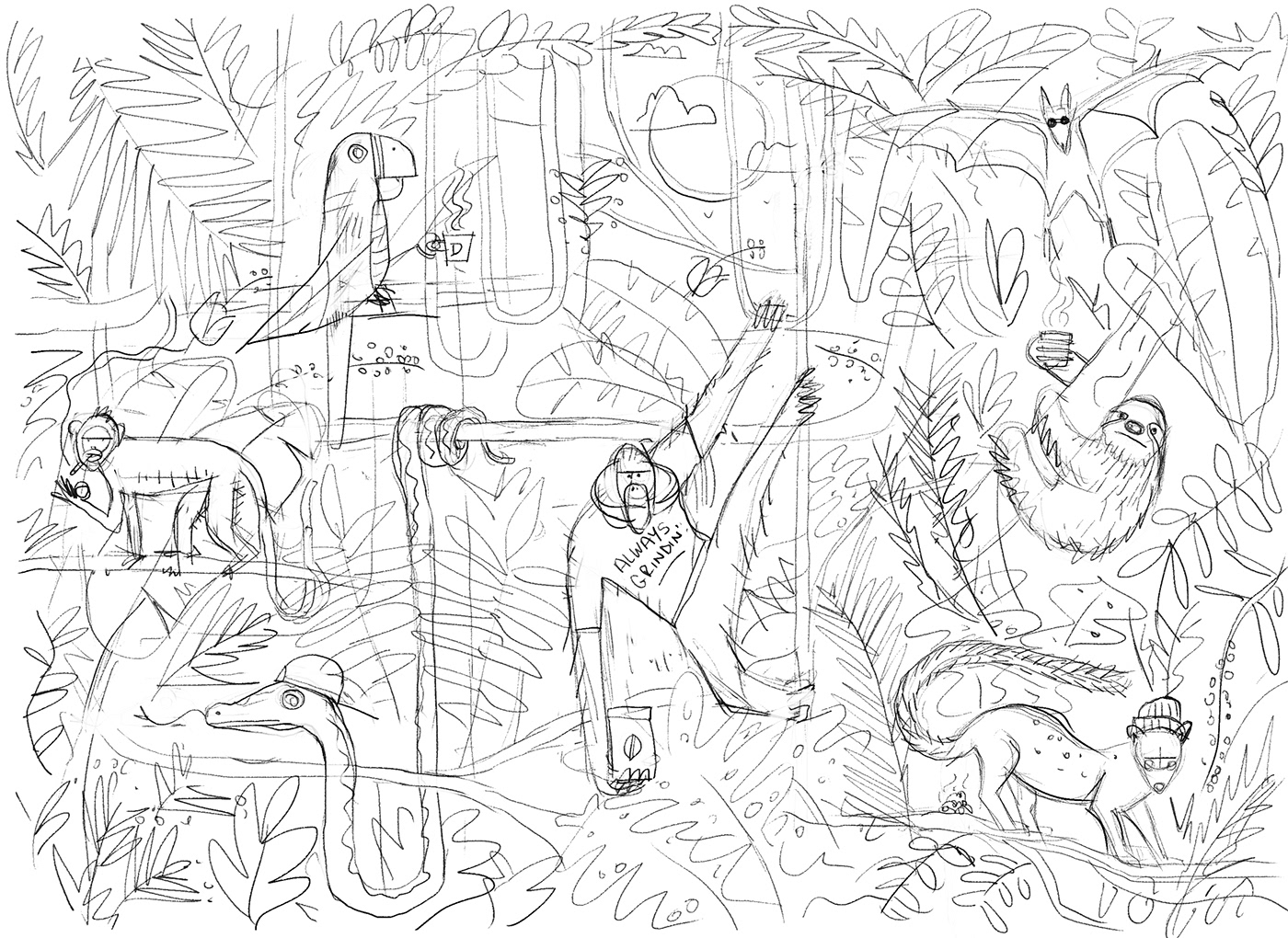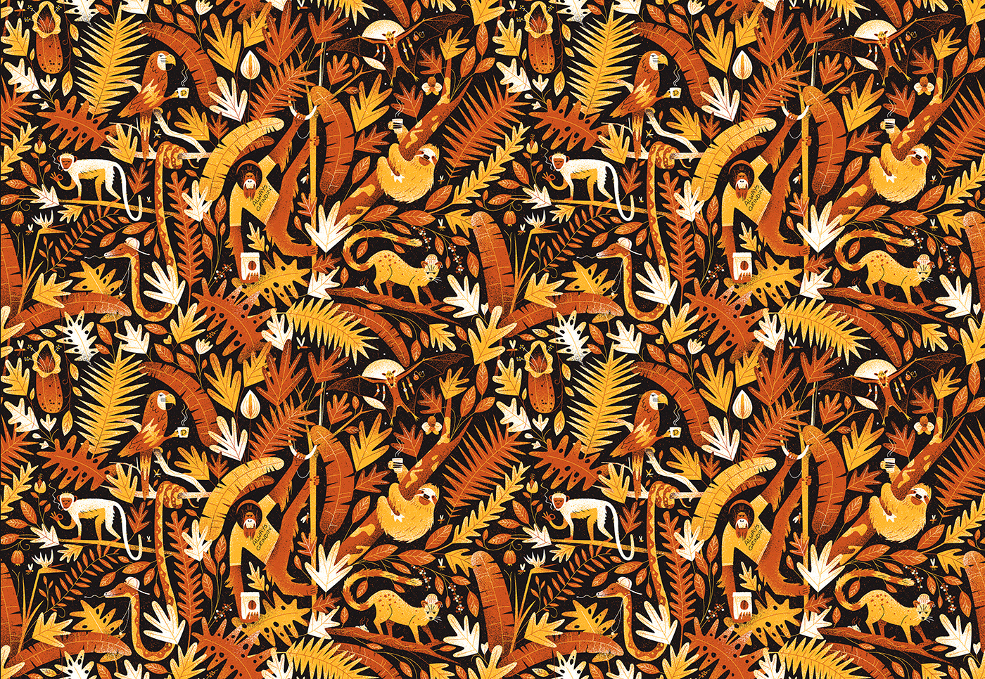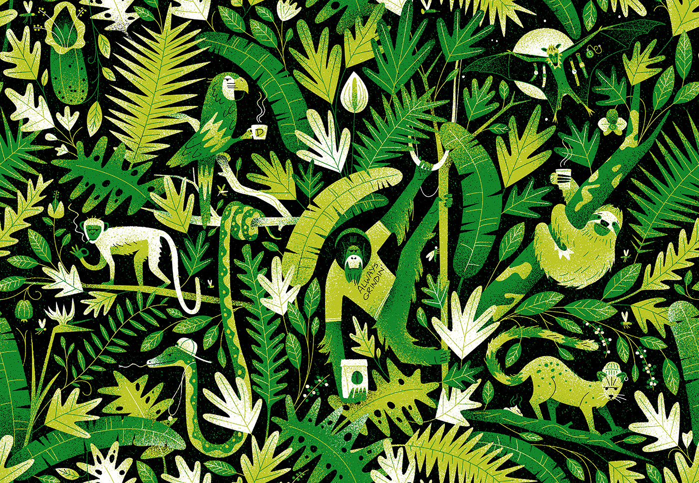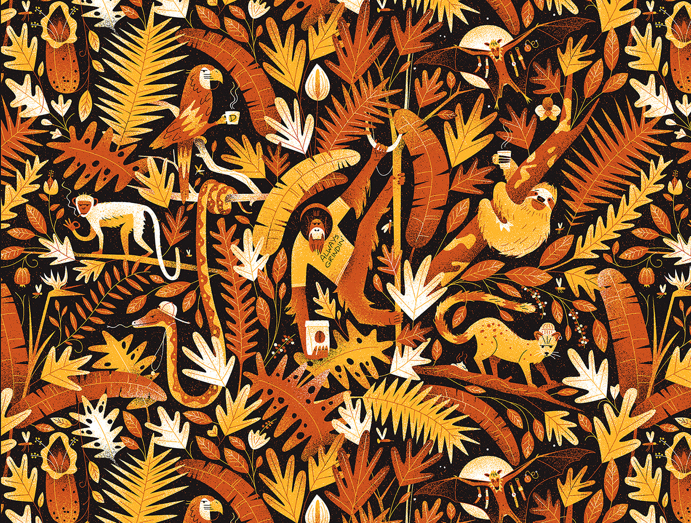 We created a wallpaper design for the interior of one of Deluxe's coffee outlets in Cape Town. The jungle-themed illustration draws on elements of coffee culture and is a nod to the various patrons who frequent their establishments.