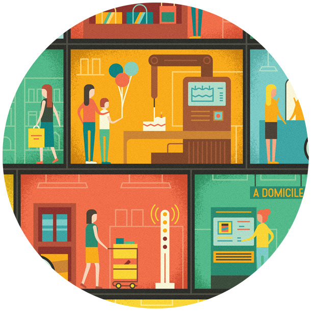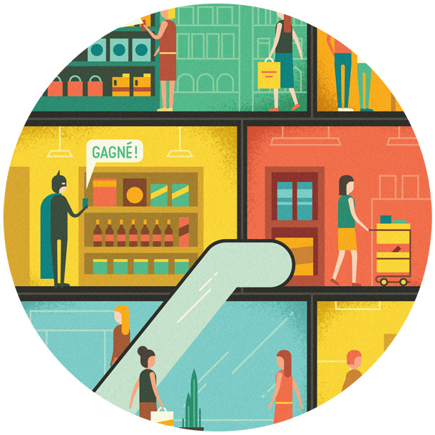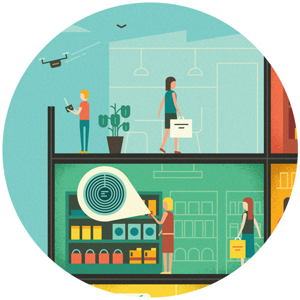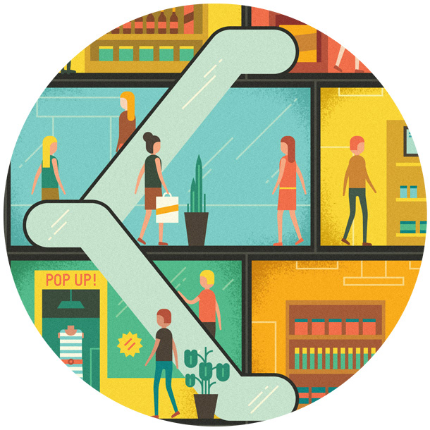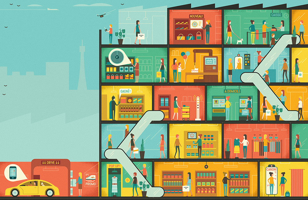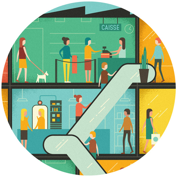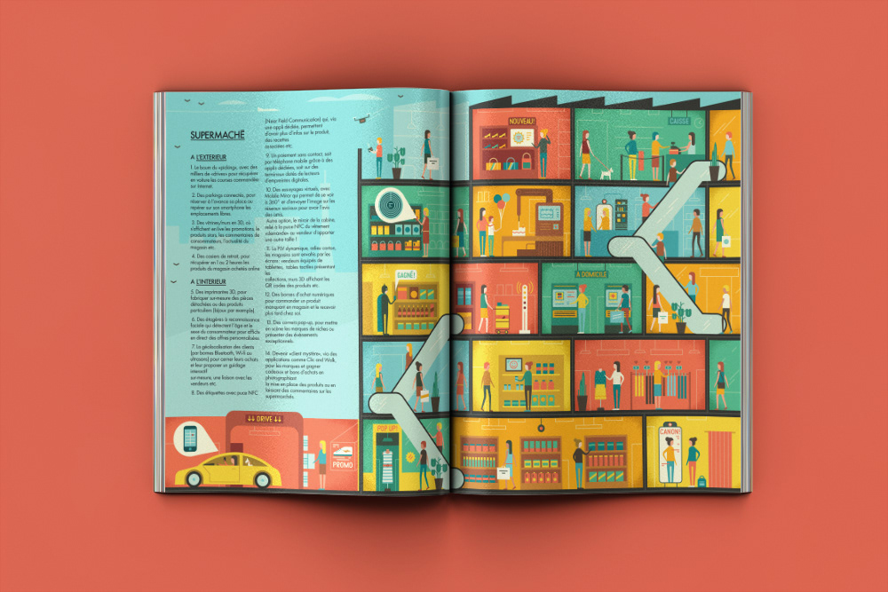 We created an illustration for ELLE France depicting a cross-section of a shopping mall. The illustrations highlighted various advances in technology which we can expect in malls of the future, from 3D printers to holographic projections.