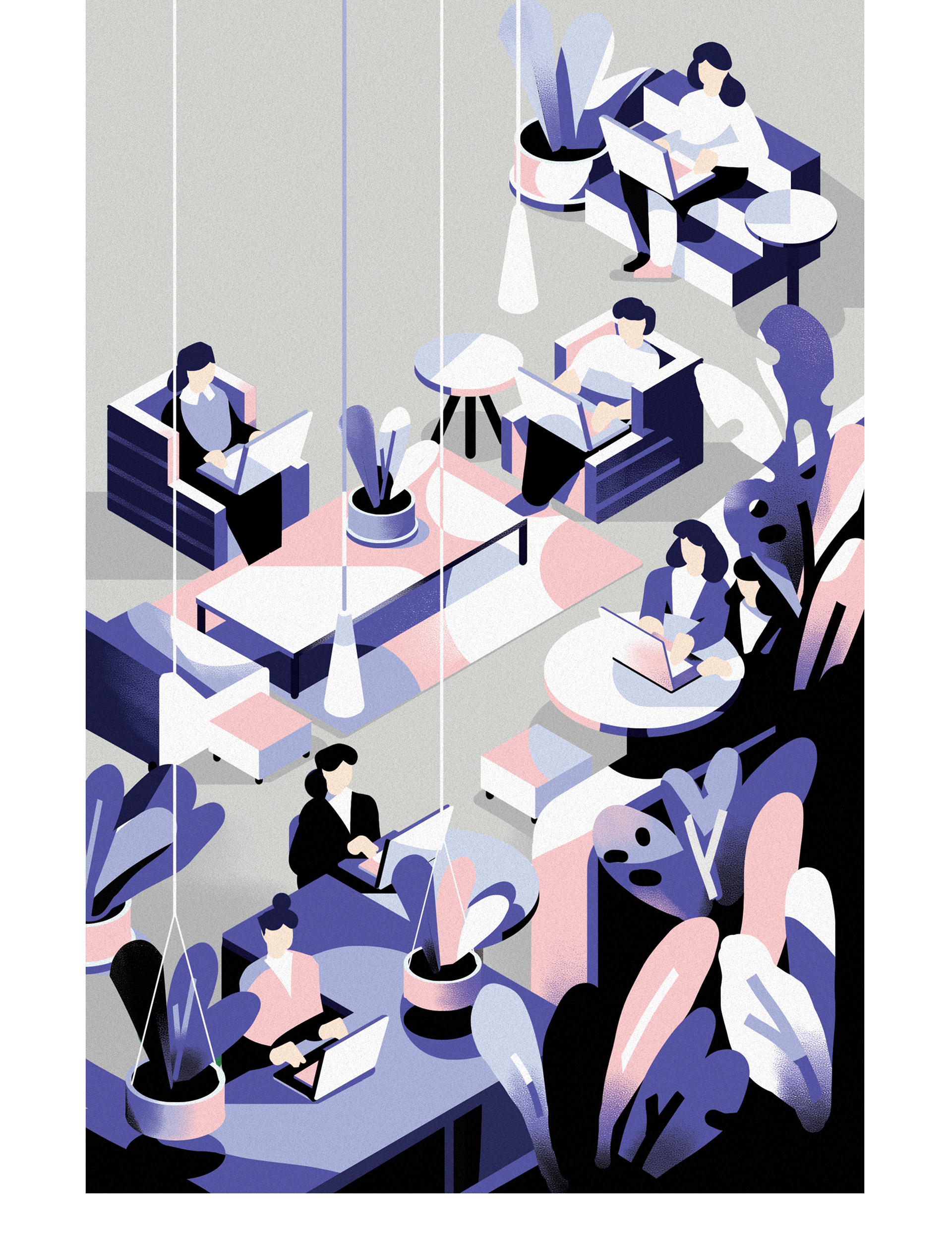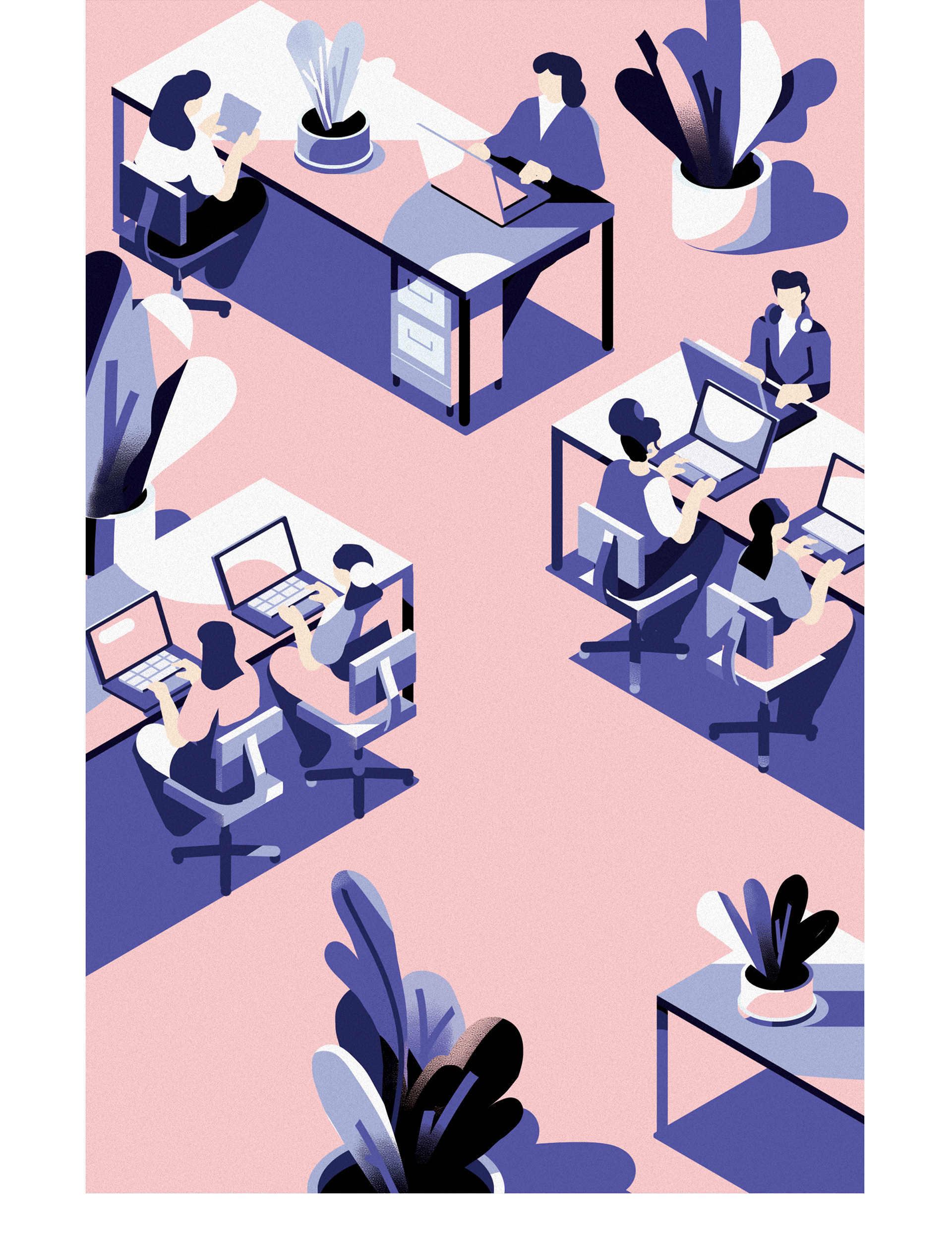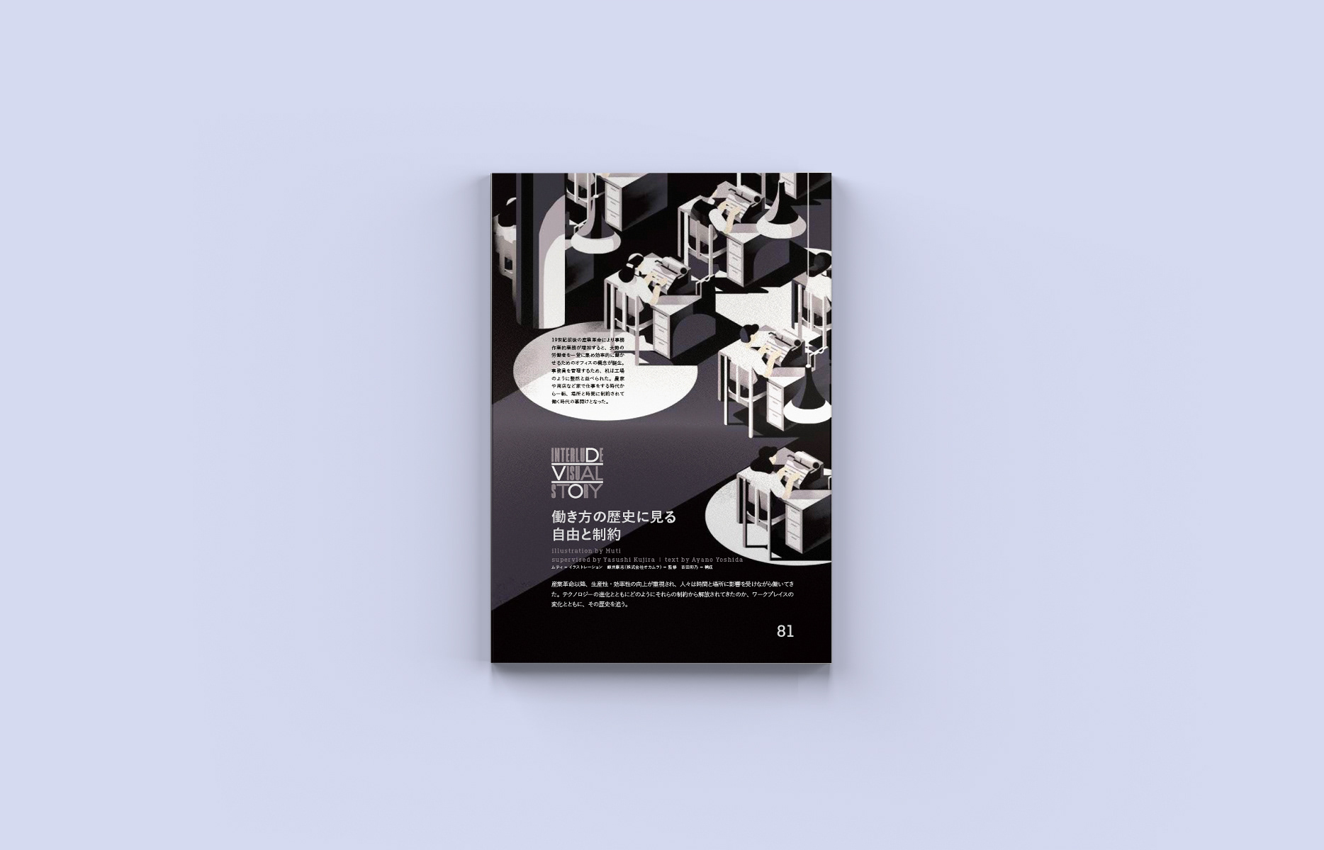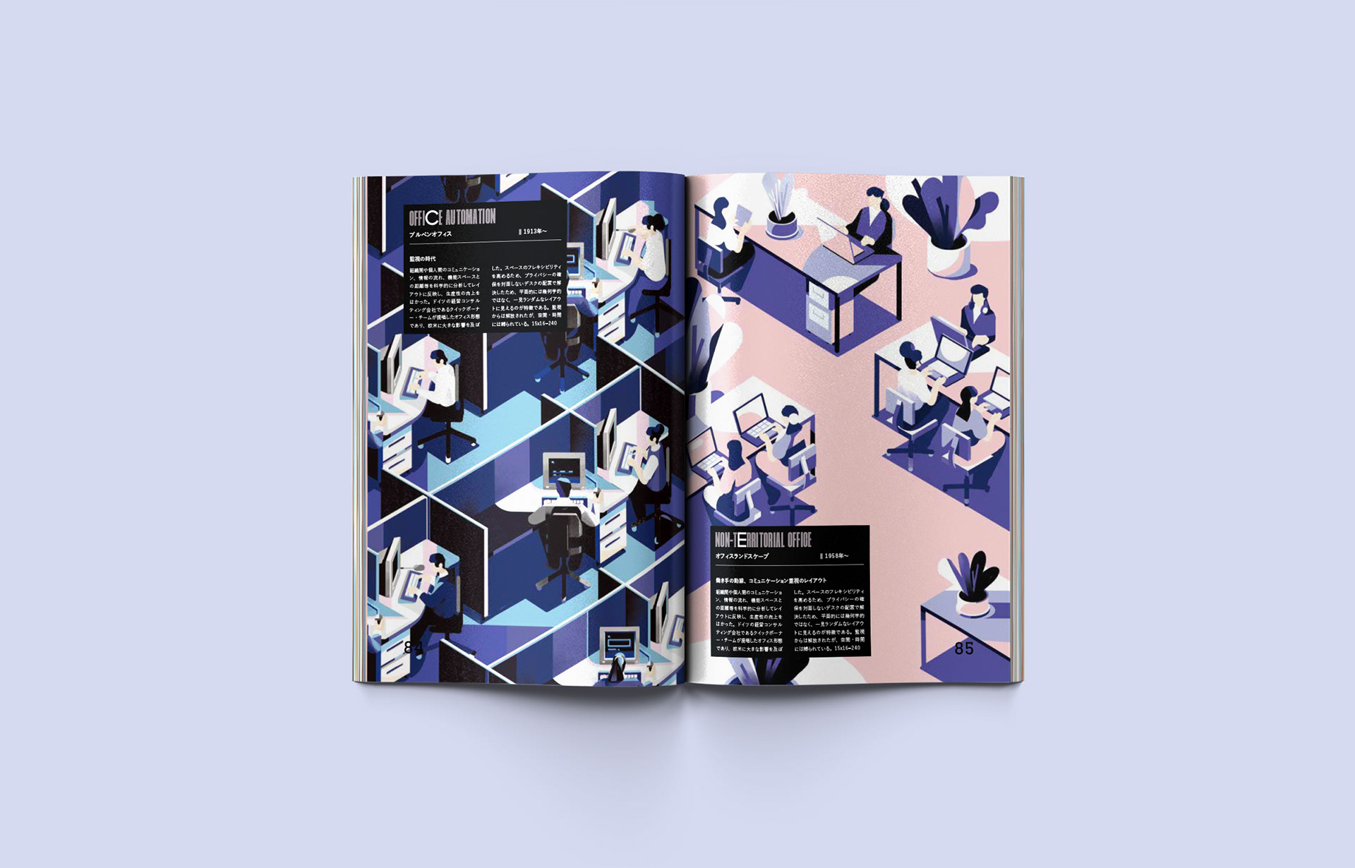 A collection of isometric editorial illustrations for Forbes Japan, depicting the evolution of the workplace from 1913 to the present.