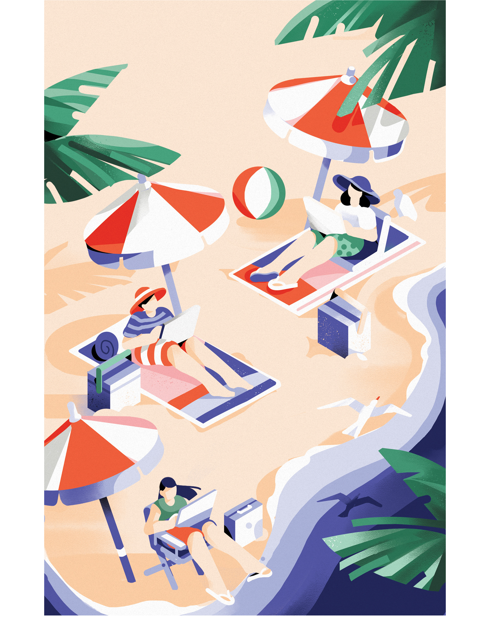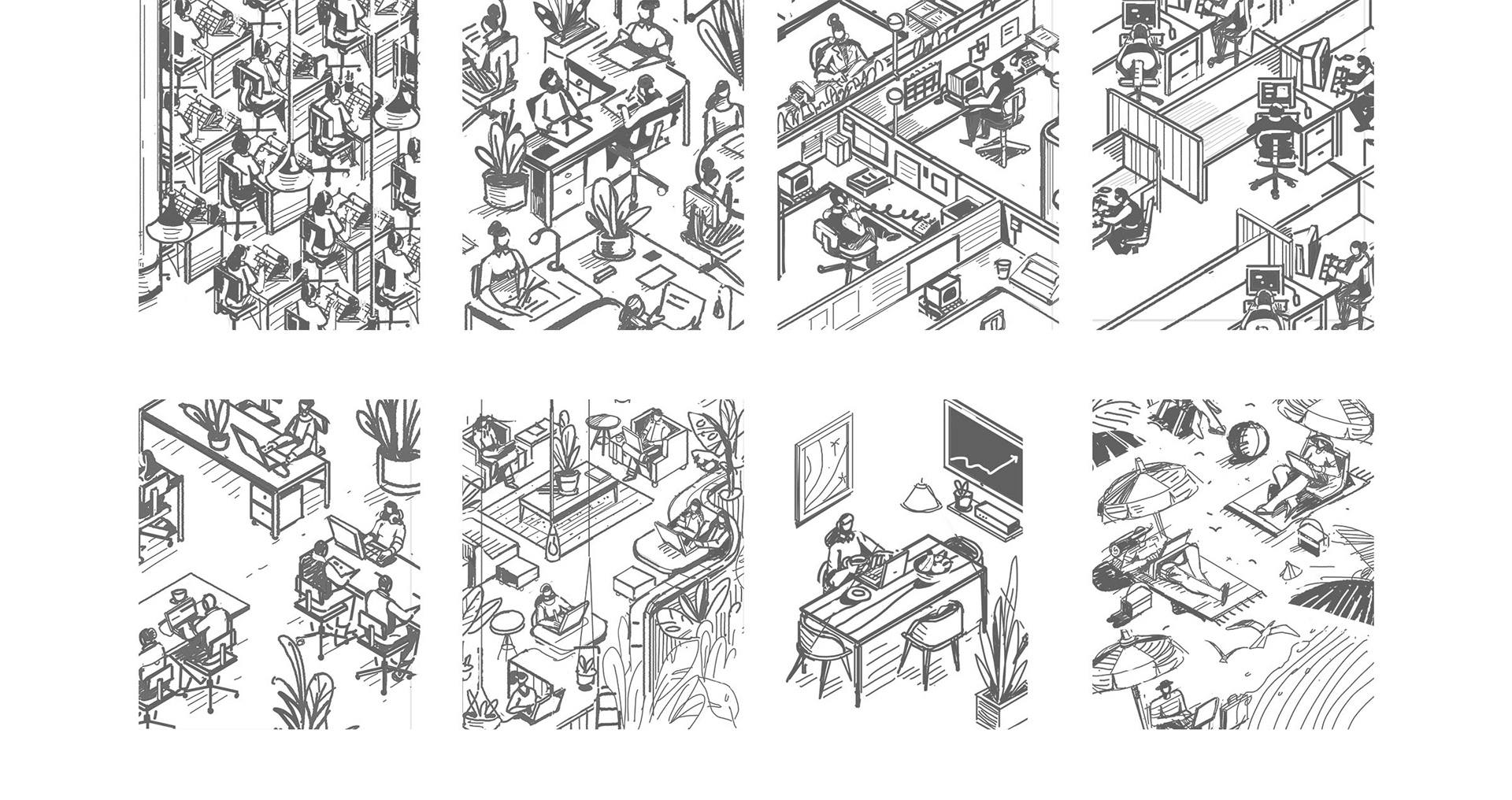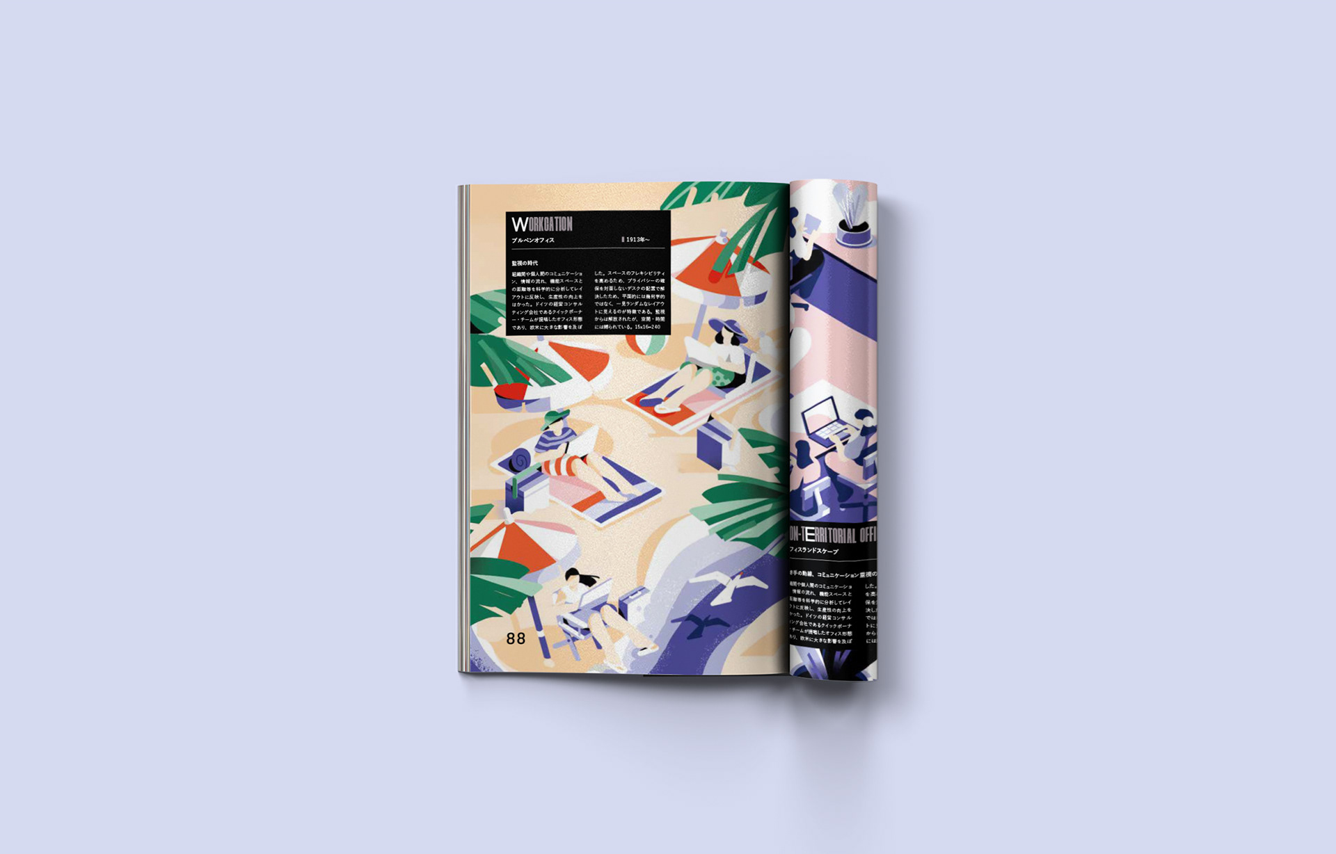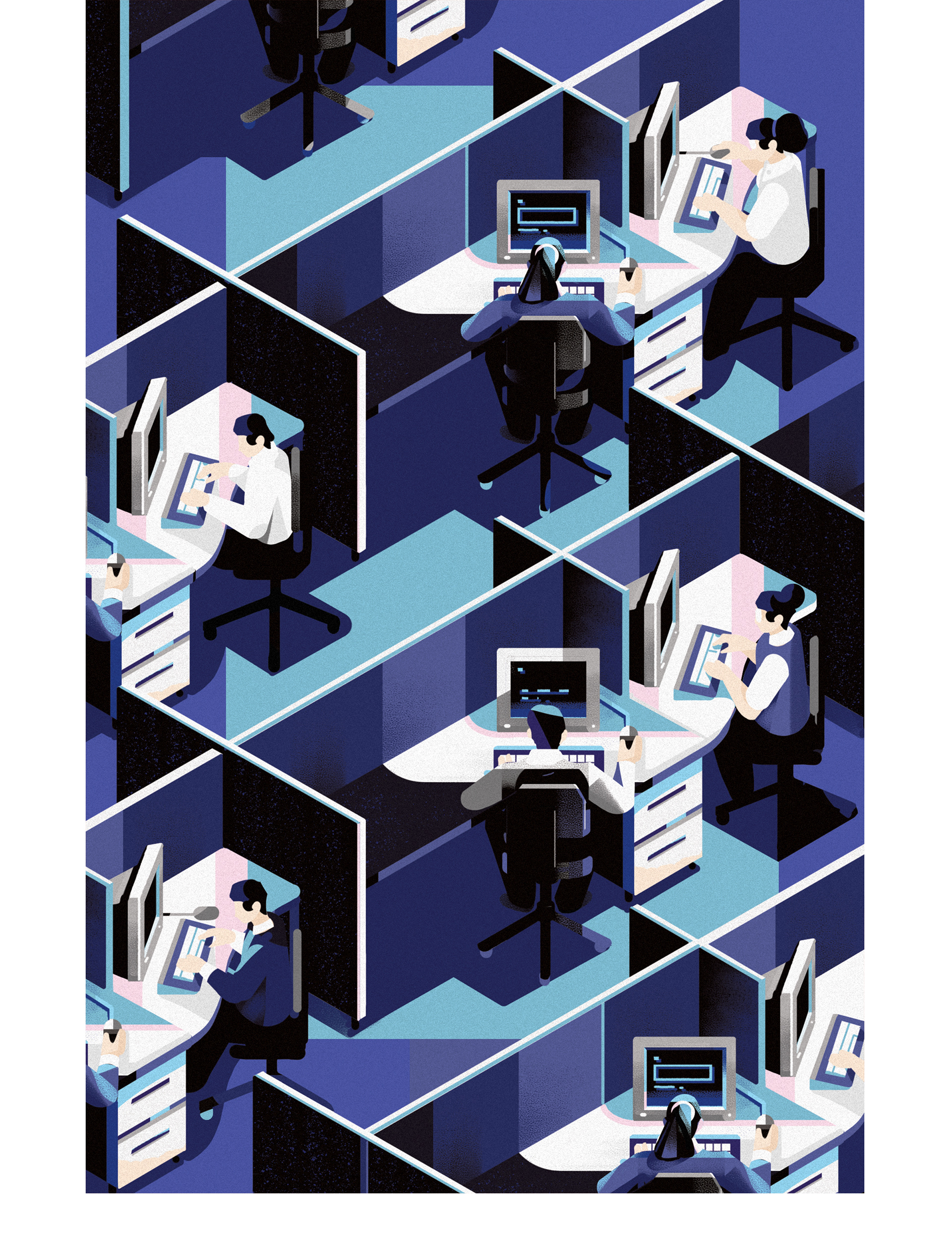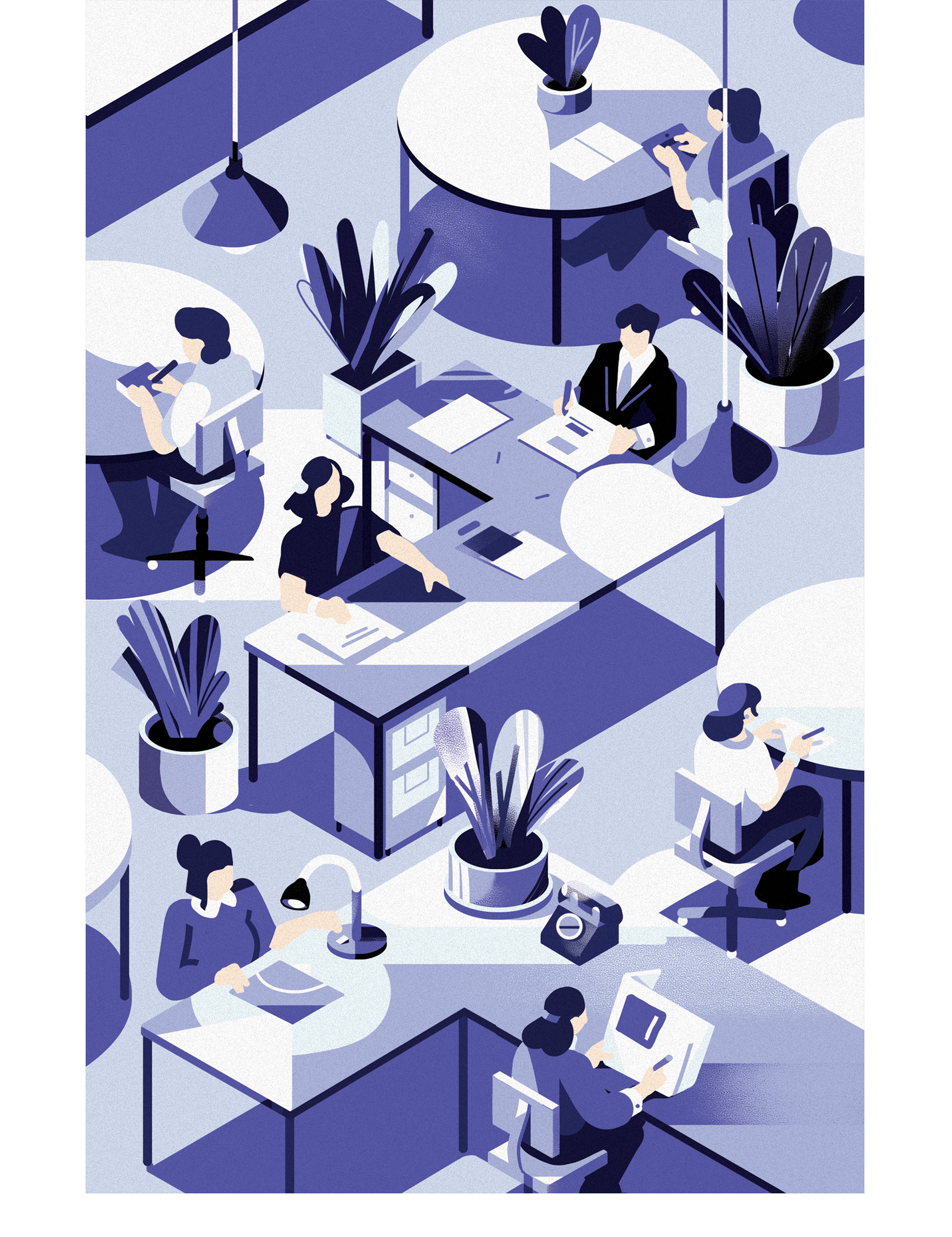 A collection of isometric editorial illustrations for Forbes Japan, depicting the evolution of the workplace from 1913 to the present.