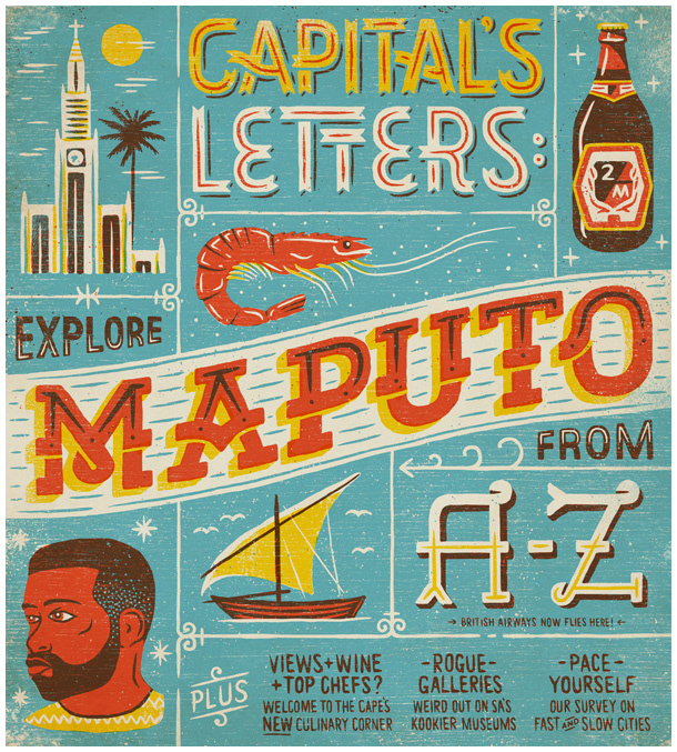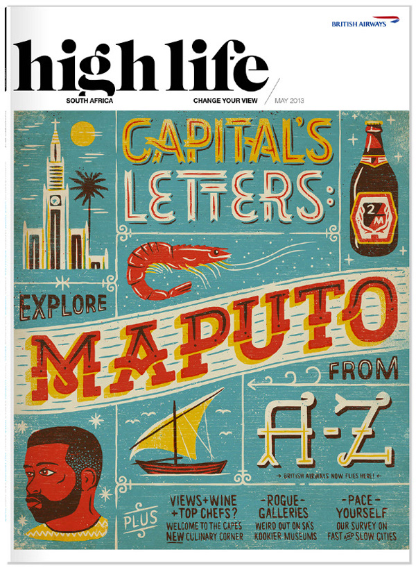 We created an illustrated cover for British Airways inflight magazine, Highlife SA. The illustration was themed on things to see in Mozambique's capital, Maputo. In addition we created a series of drop caps which were used for the accompanying article. 2013 Pearl Award winner • Gold - Best cover • Gold - Best use of typography