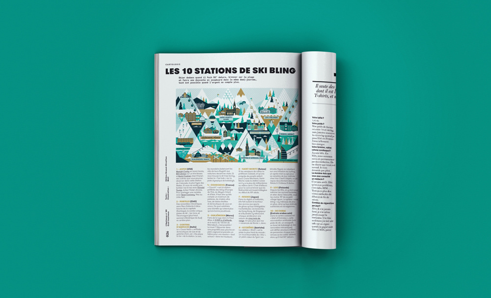 L'Optimum is a men's French lifestyle Magazine. Other than having some of the most famous male actors, sportsman and personalities on their covers they also feature fashion, photography and luxury items. We illustrated three maps for the magazine, but not your normal travel information. We covered editorial topics from the top ghost towns to ski bling towns and finally, the top Italian restaurants in Paris. We explored various styles to capture the essence of the editorial.