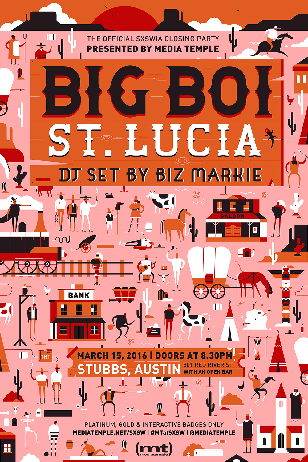 Media Temple traditionally host the closing party at SXSW and this year was no different. The party was headlined by Big Boi and opened by St. Lucia and Biz Markie. The event called for an impactful poster that was displayed on the streets of Austin. Using the graphics from the poster we created various short animations that were screened between artists on the night.
