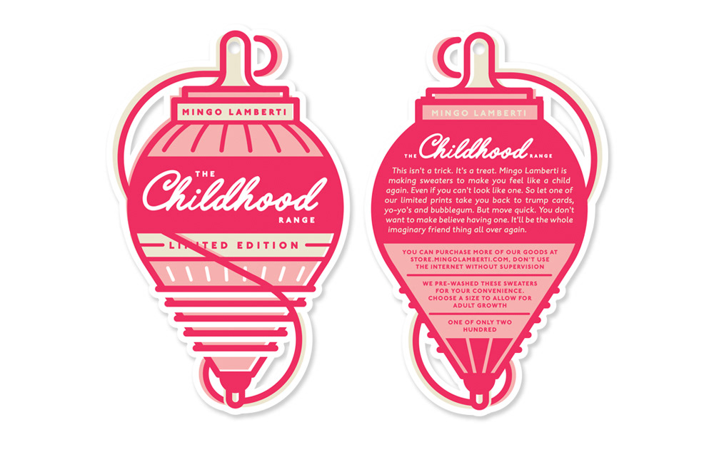 Cape Town design goods manufacturer Mingo Lamberti asked us to create two illustrations for their 'Childhood' range, taking inspiration from memories of being a young kid. In addition we created a spinning top illustration for their swing ticket.