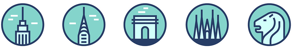 Empire State Building, Chrysler Building, Arc de Triomphe, Sagrada Família, Merlion Statue