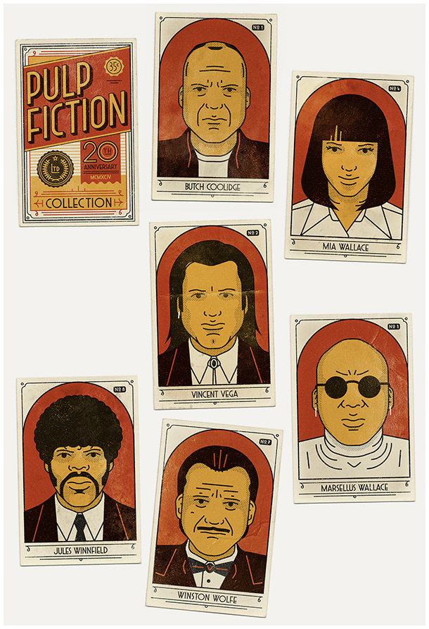 2014 marked the 20th anniversary of Tarantino's cult classic, Pulp Fiction. We paid homage to this landmark in contemporary cinema by creating two sets of illustrated posters as well as a series of character portraits inspired by vintage cigarette collectors cards.