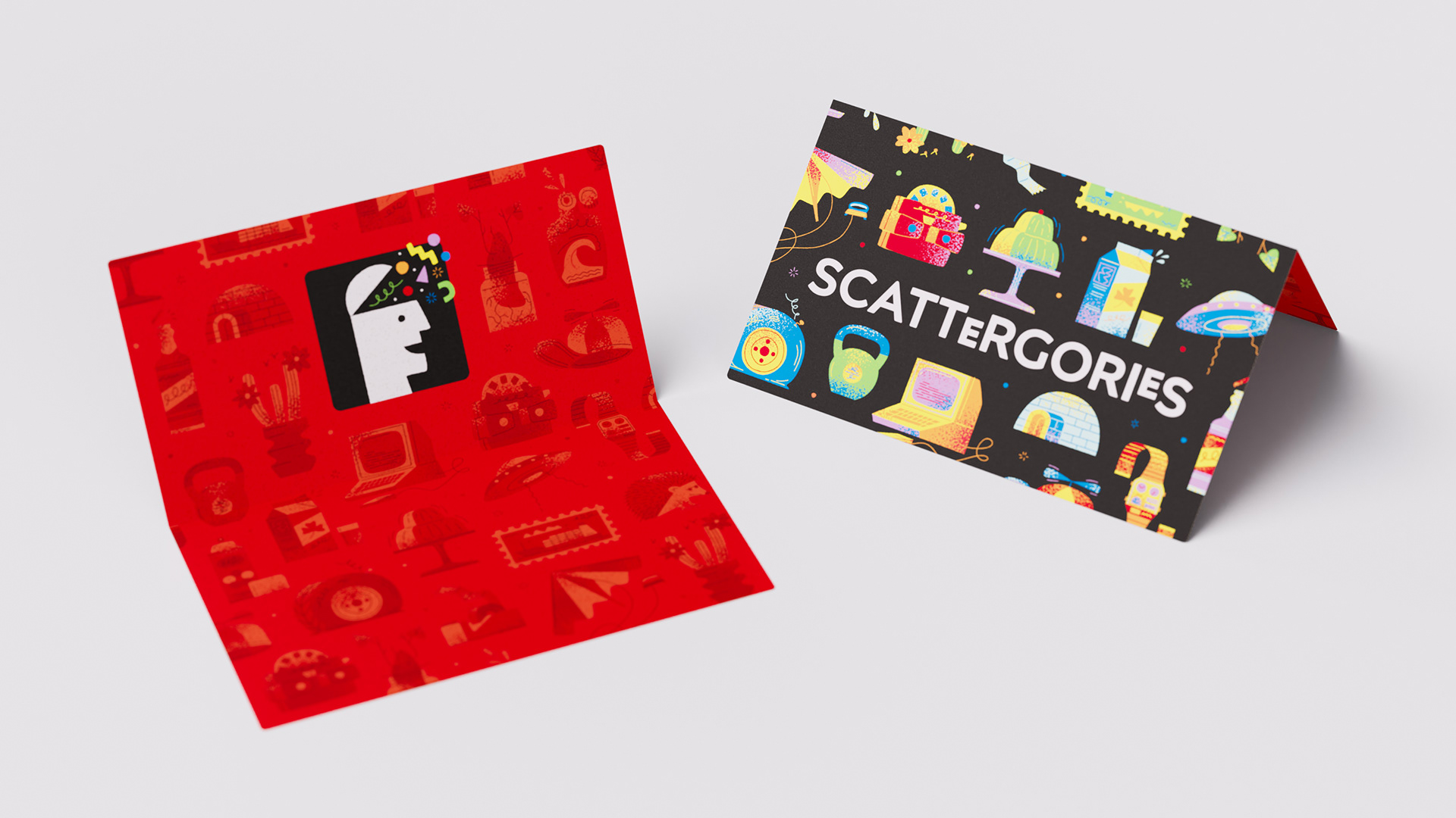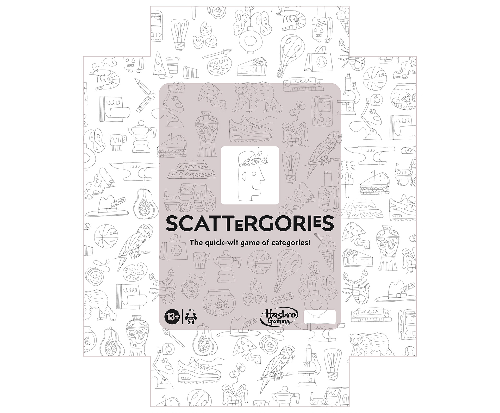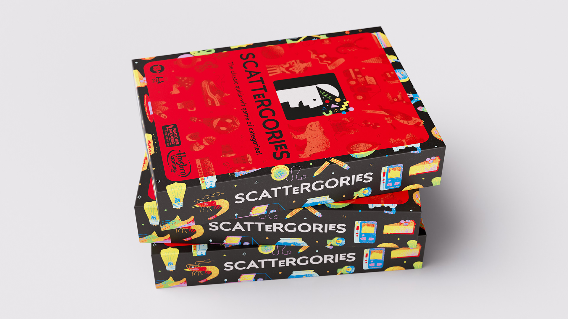 We worked with Hasbro to reimagine the packaging for Scattergories, their classic category-based party game. We created a pattern for the box and folio and updated the logo to match the look and feel.