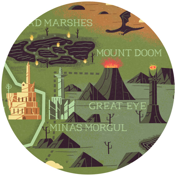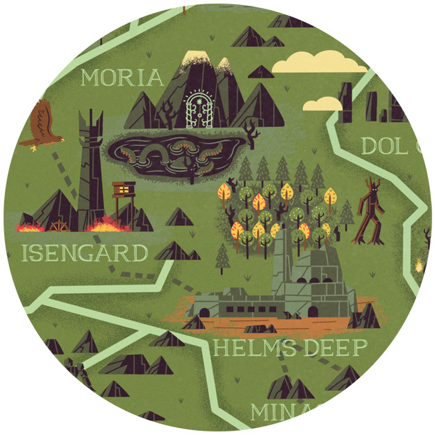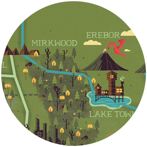 As fans of J. R. R. Tolkien's well known books and their film adaptations, we chose to illustrate a map of Middle Earth, the setting for The Hobbit and The Lord of the Rings. We depicted several landmarks which were prominent in these stories.