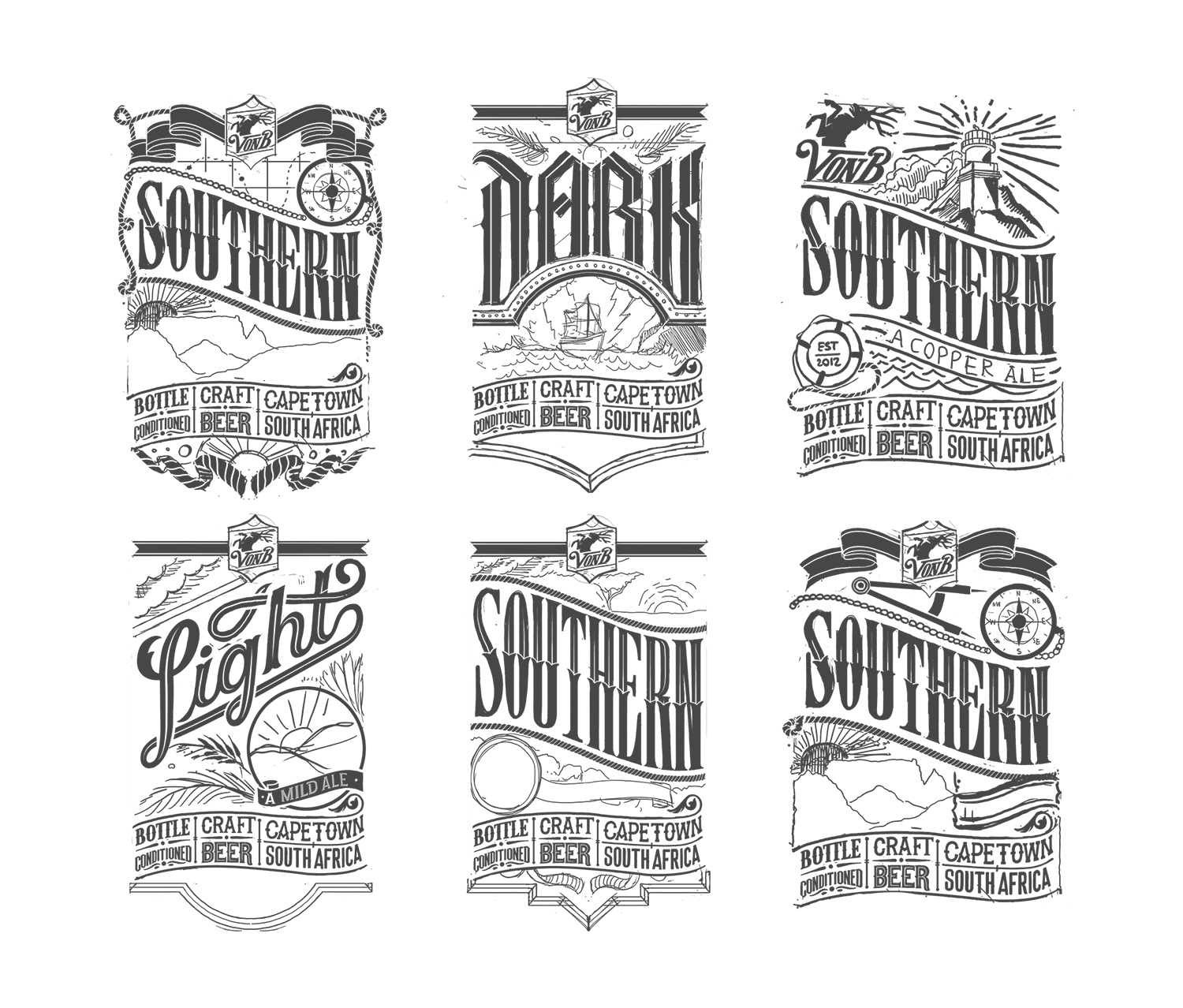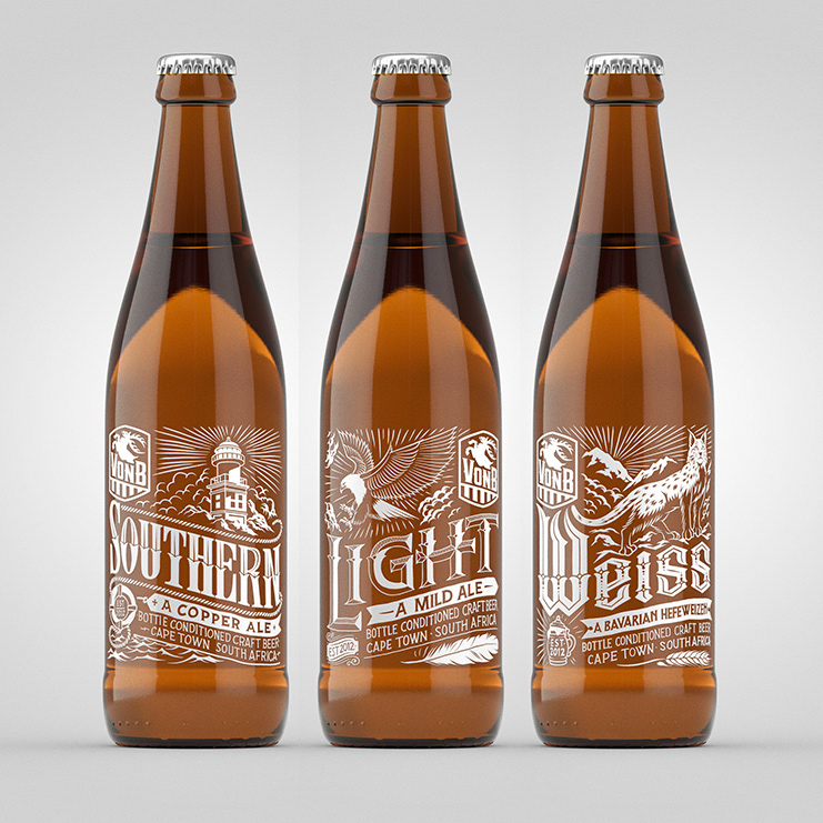 We developed a logo and three beer labels for VonB Breweries, a micro brewery in Kommetjie, Cape Town. The Von Brandis family crest served as inspiration for the logo, while the labels drew from the different hops that the beers are brewed from.