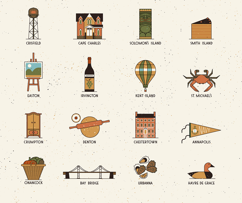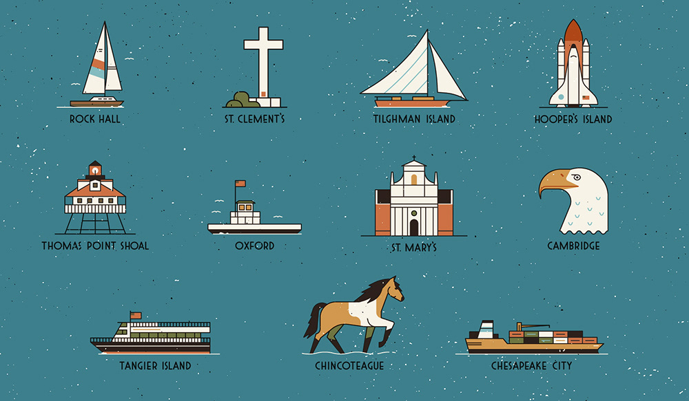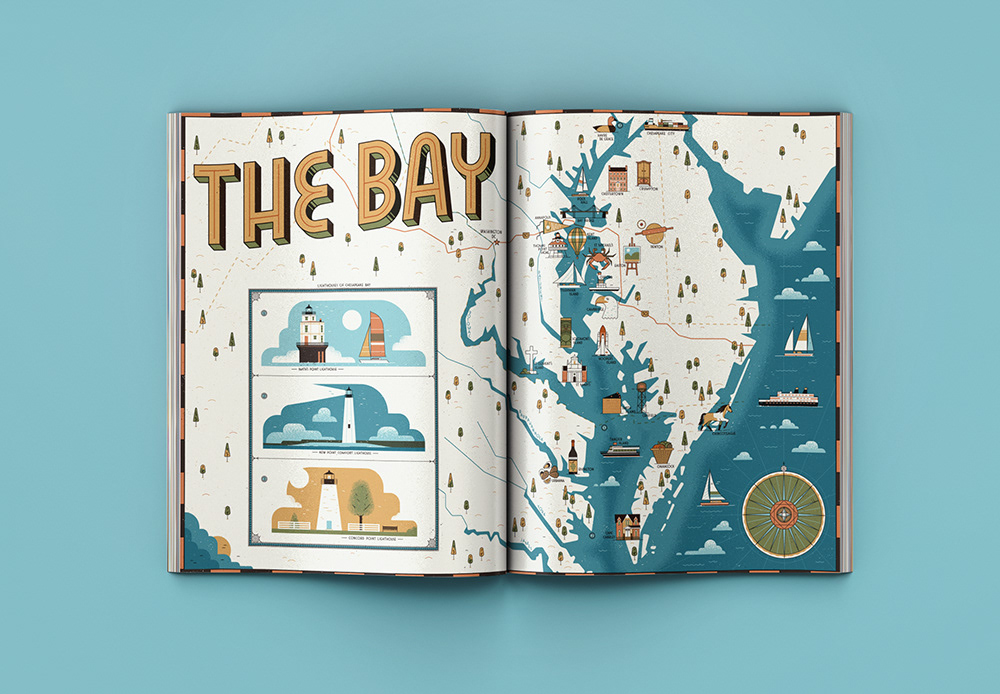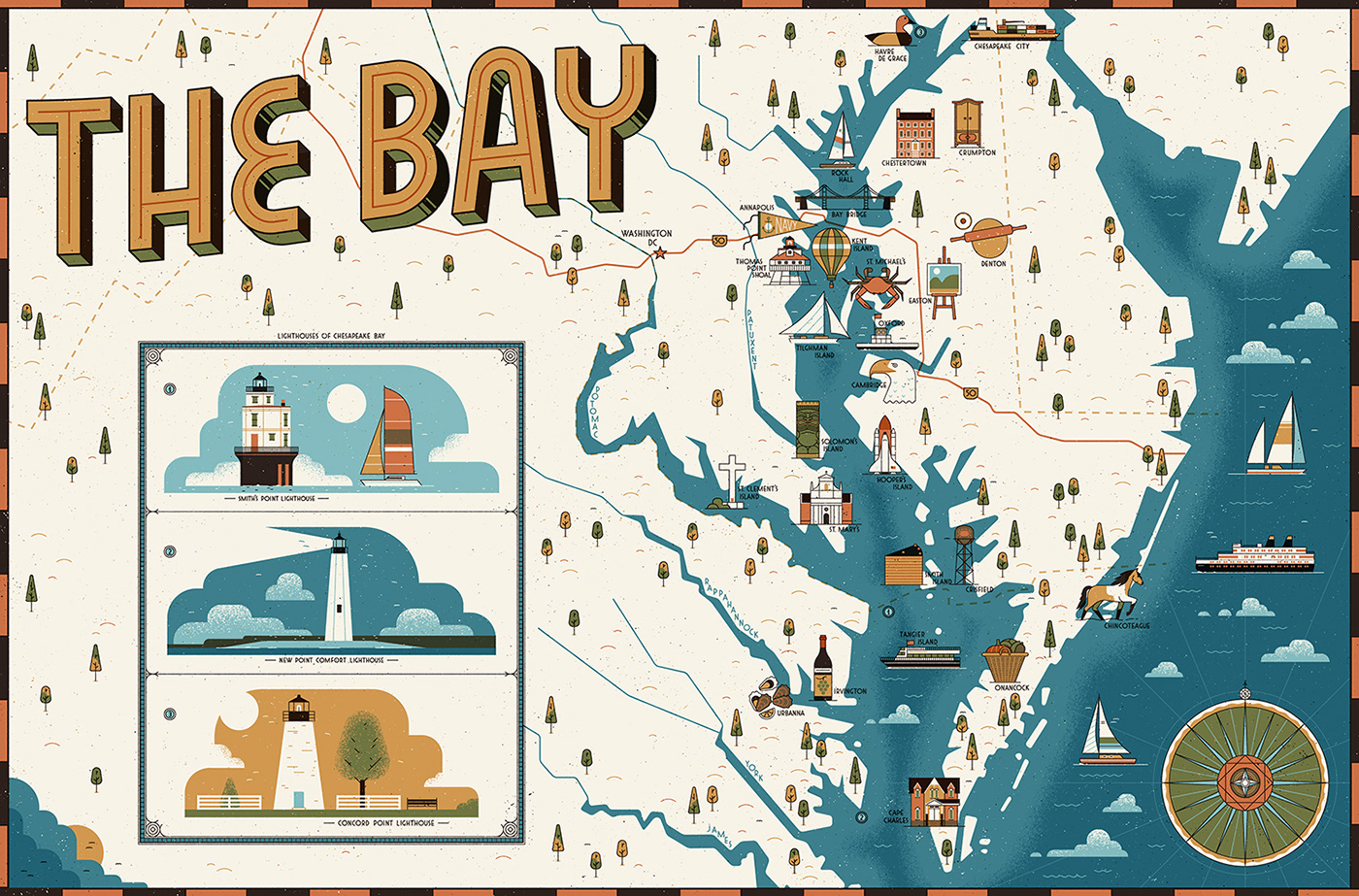 We created an illustrated map of the Chesapeake Bay area for Washingtonian magazine, highlighting various towns and landmarks.