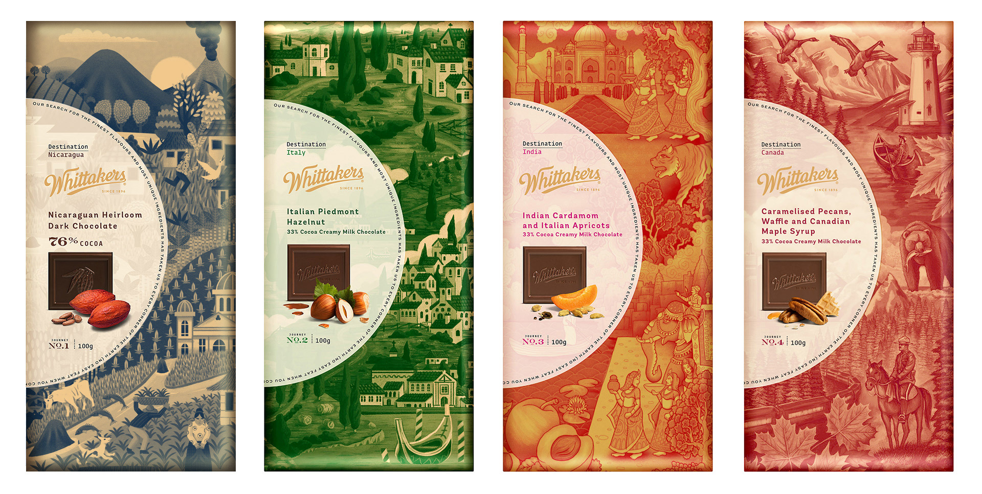 We were commissioned by New Zealand chocolate brand Whittaker's to illustrate four wrappers for their new Destinations Collection.