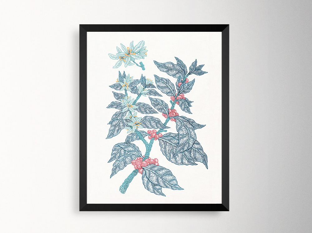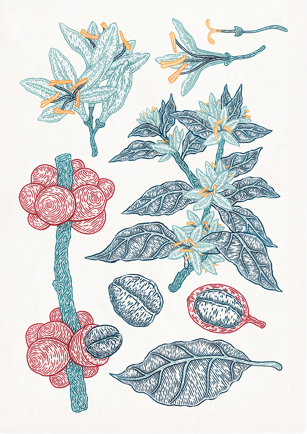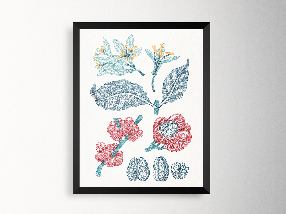 Various botanical studies of the coffee plant created for Woolworth's exclusive Waterstone Café.