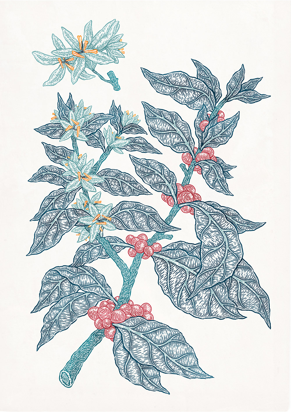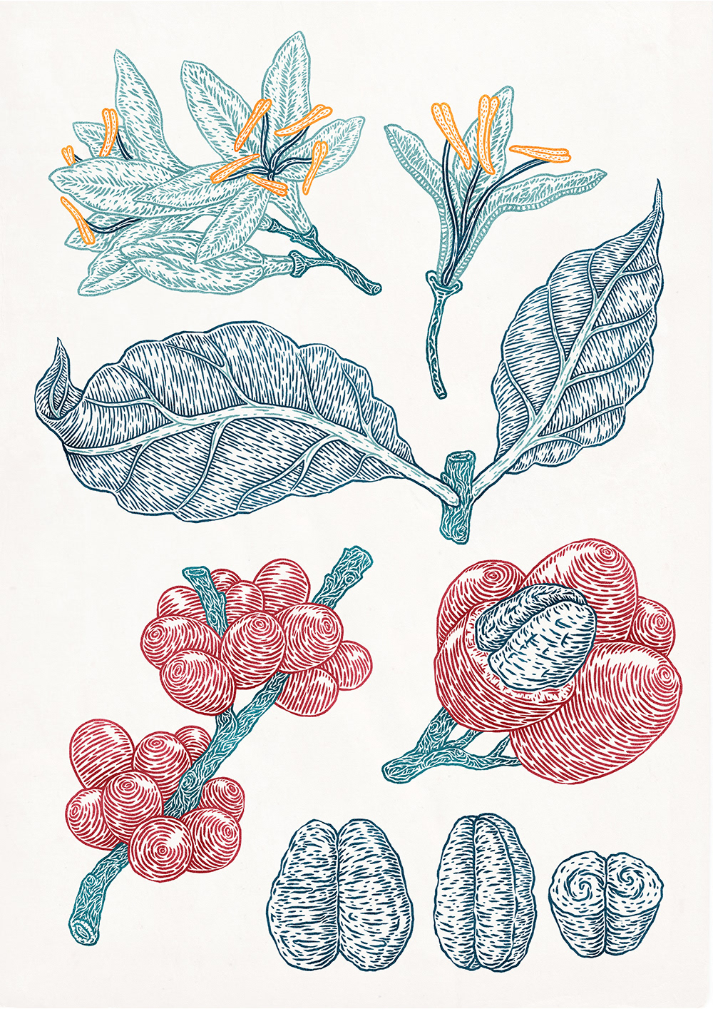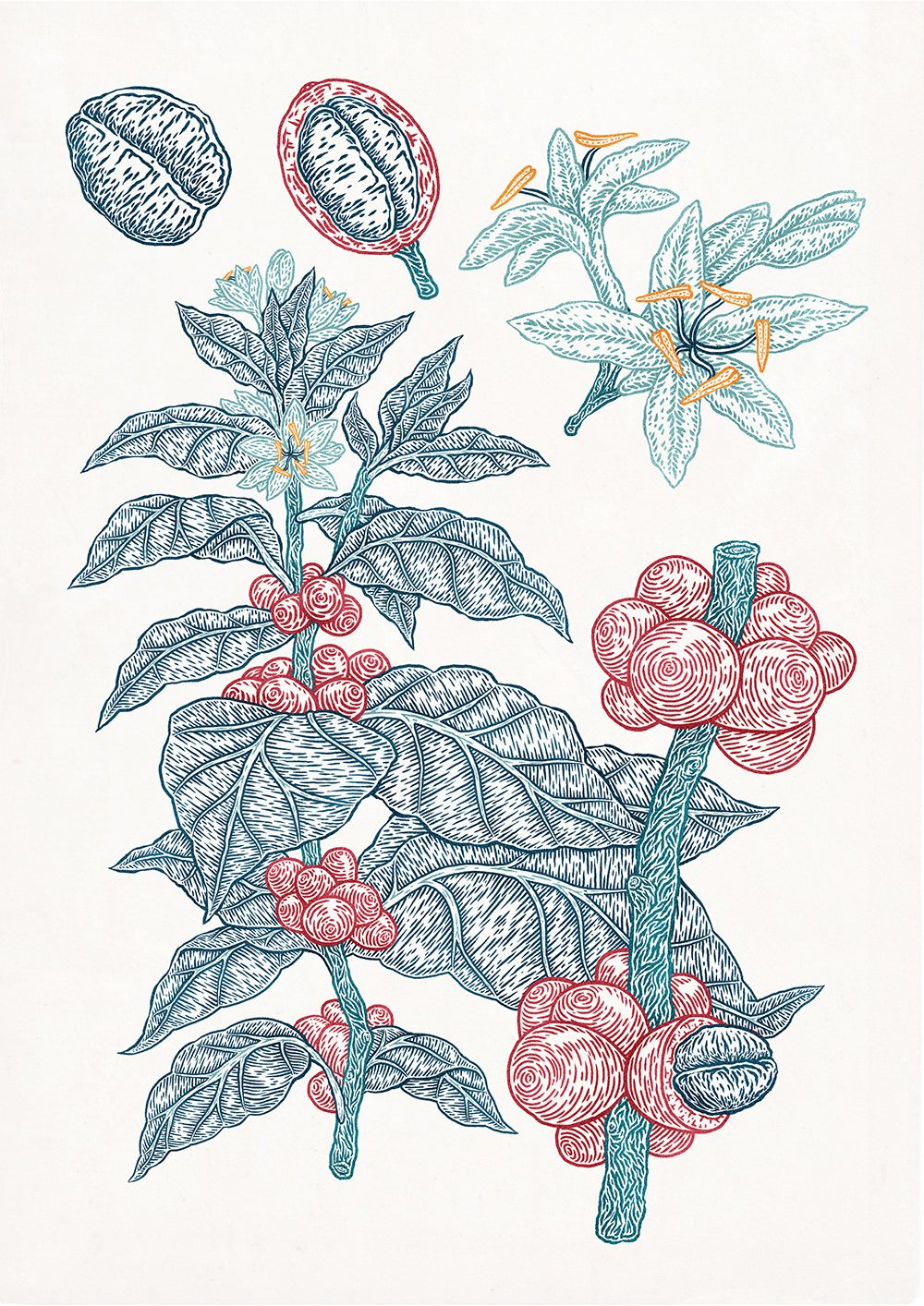 Various botanical studies of the coffee plant created for Woolworth's exclusive Waterstone Café.